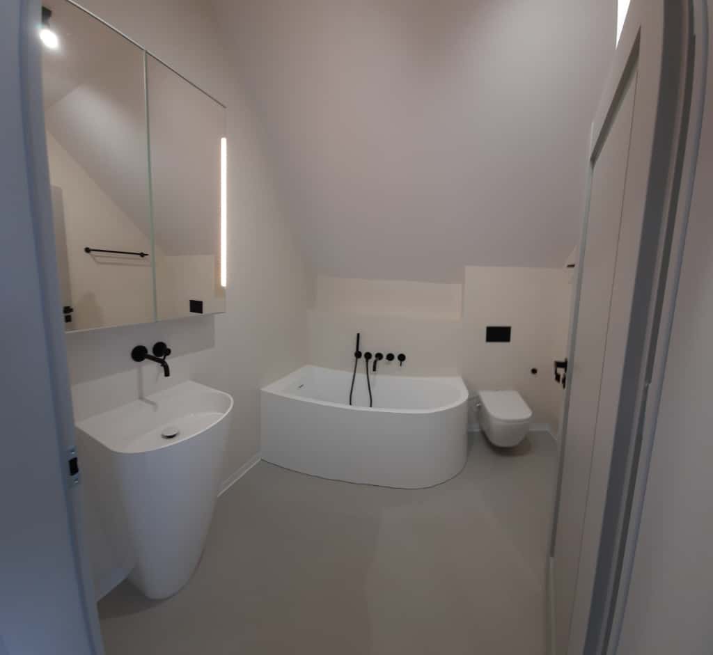 Mikrocement w łazience to wodoodporna, bezspoinowa powierzchnia. Doskonale sprawdza się w strefach prysznicowych i na ścianach. Łatwy w czyszczeniu i bardzo nowoczesny wizualnie.
